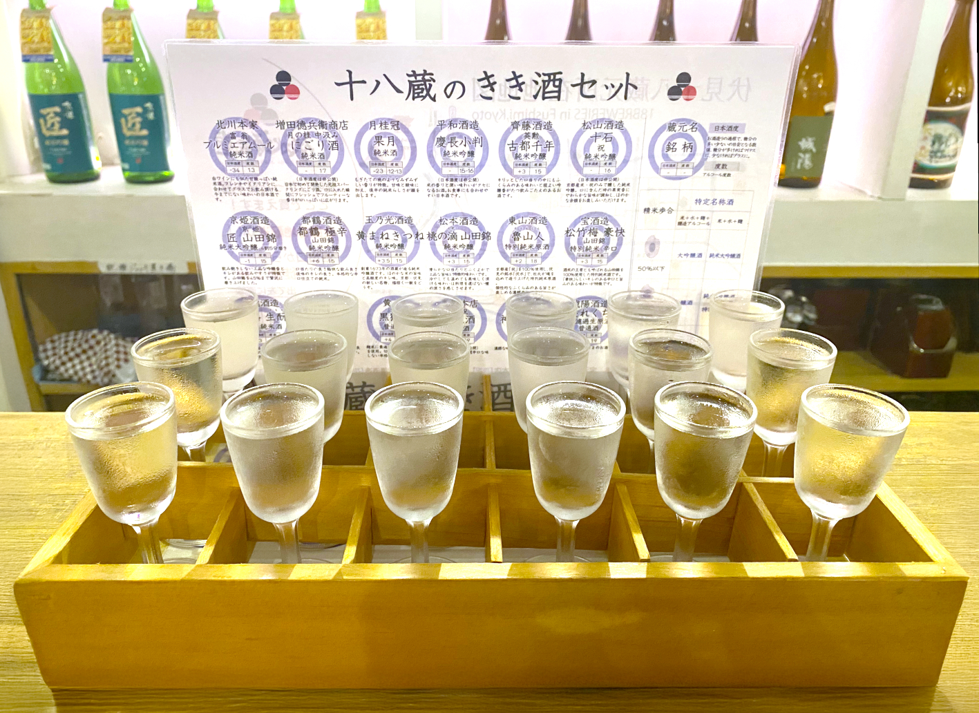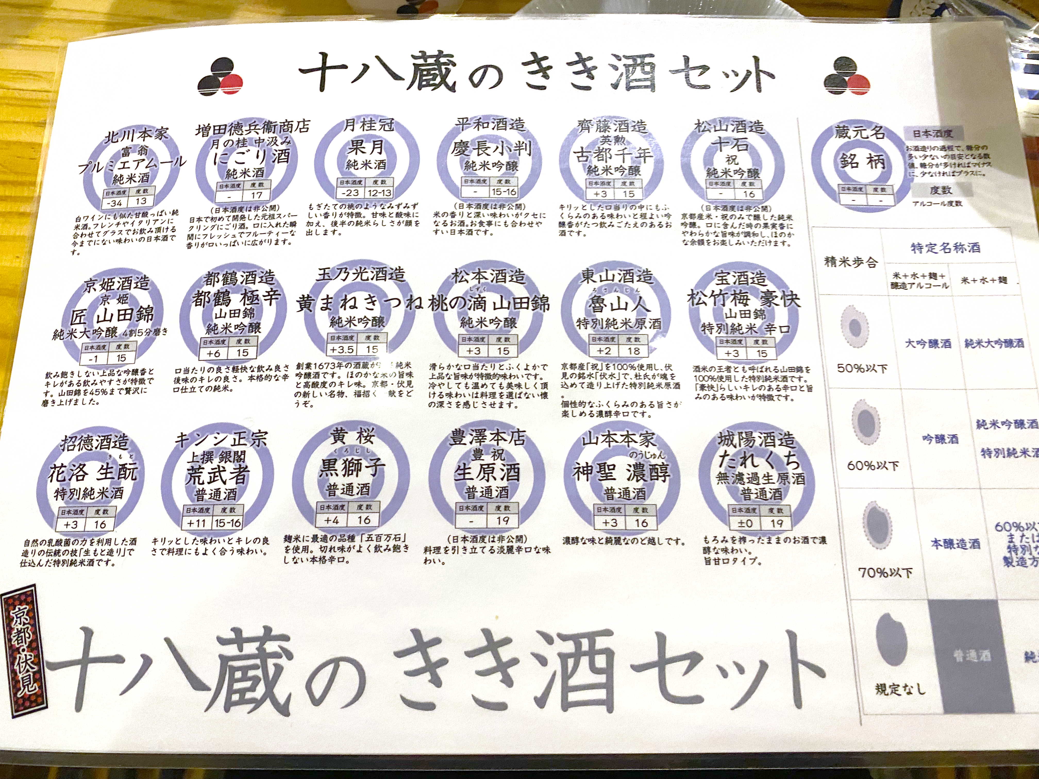 伏見の酒150銘柄以上があるというこちらの名物が、この十八蔵のきき酒セットである!