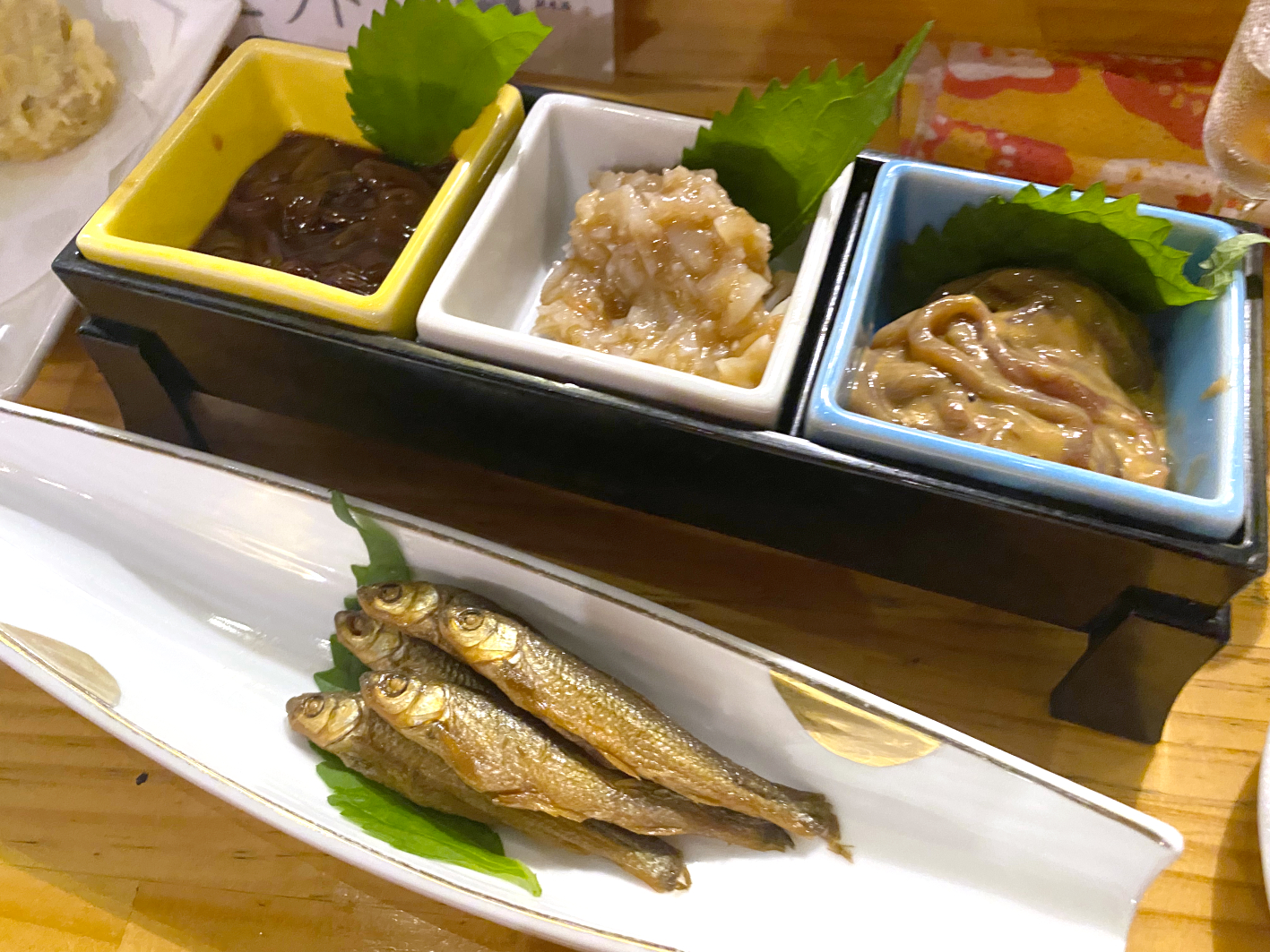 ・珍味三種(ほたるいか沖漬け、梅なんこつ、イカの肝あえ)