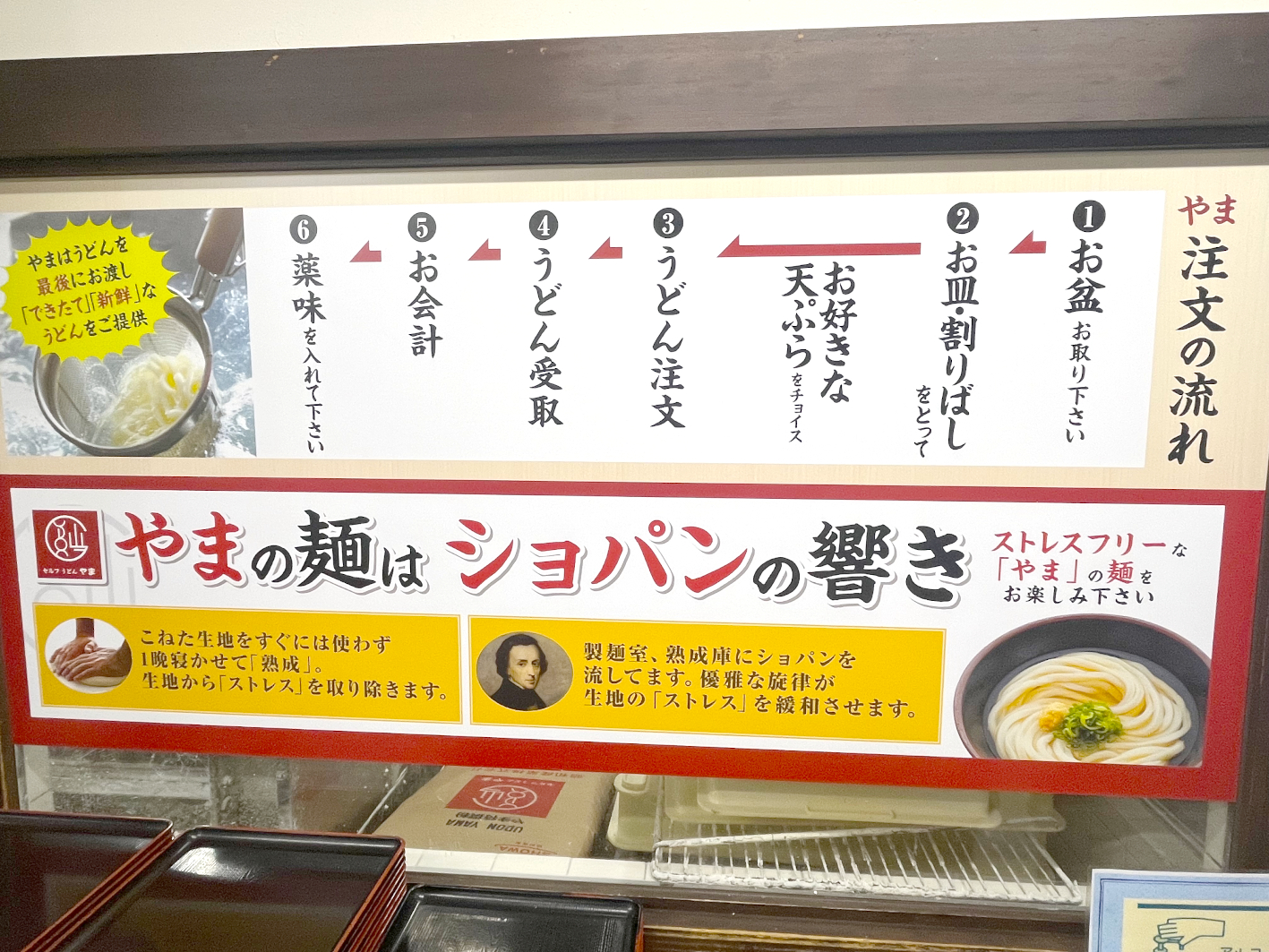 ここの麺の美味しさの秘訣が店内に貼ってあった。製麺室と熟成庫にショパンをBGMで流しているらしい。「ショパンの優雅な旋律が生地の『ストレス』を緩和させる」とのことだ。……目から鱗だ!