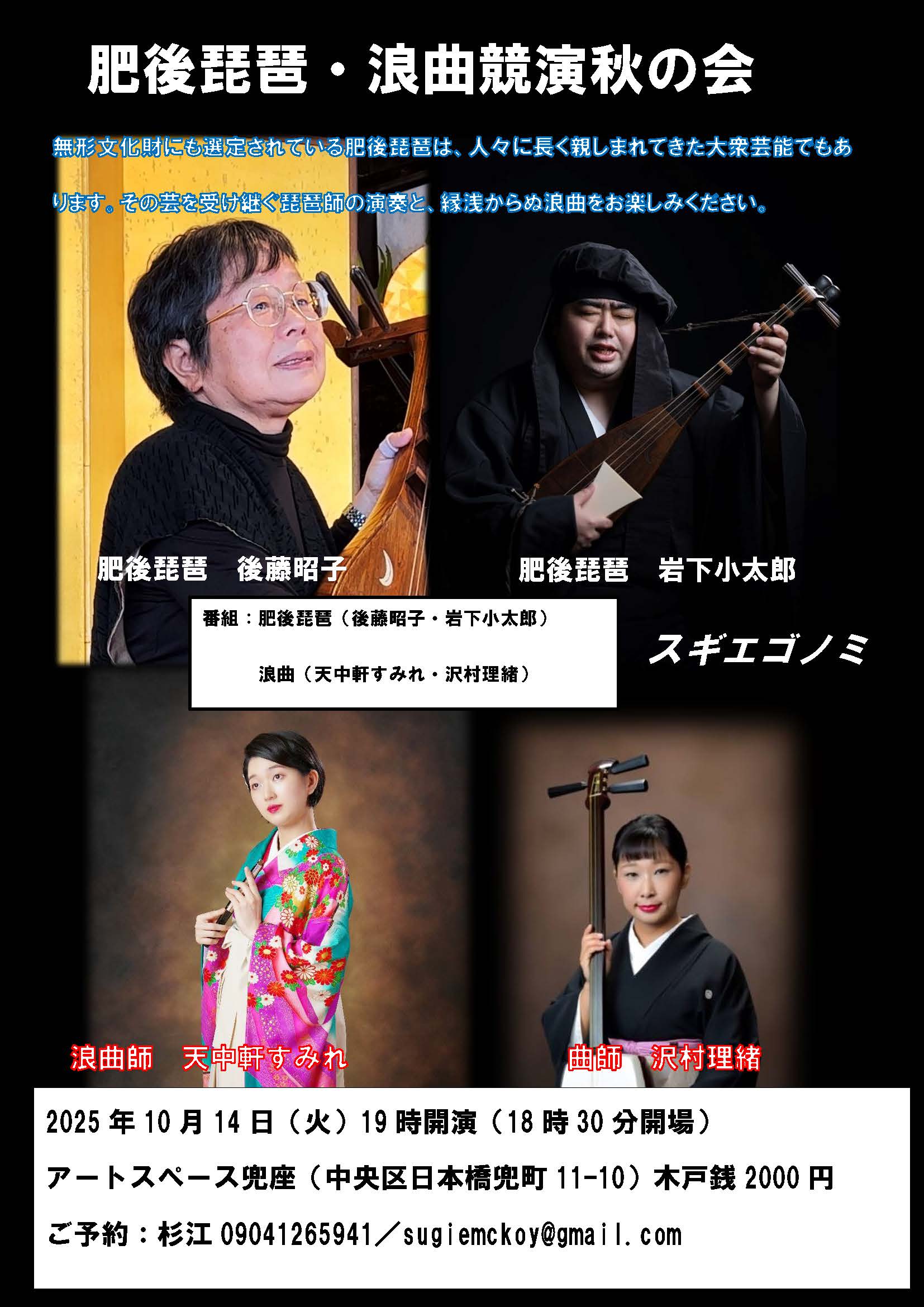 最後に1つだけ宣伝をお許しいただきたい。来る10月14日(火)夜、アートスペース兜座にて杉江主催で「肥後琵琶・浪曲競演秋の会」という会を予定している。