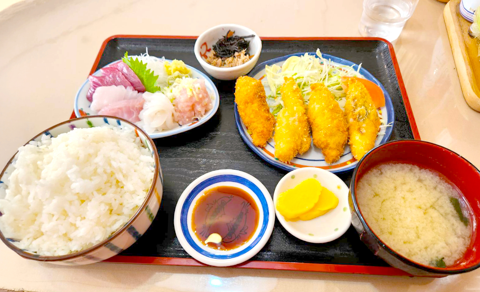 まるろの「白身フライ刺身セット定食」