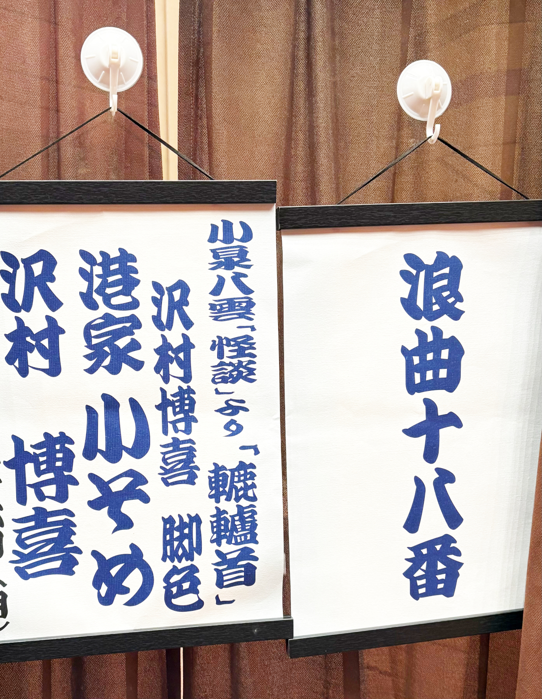 「怪談」は、セツが八雲に話した伝承話や、幽霊話がもとになっているそうで、八雲はセツが本から知った話であっても、本は読まずに必ずセツの言葉で語ることを好んだそうで、セツさんの言葉を通して八雲さんに、それがまた博喜さんを通って浪曲になるというのは面白いなぁと思います。