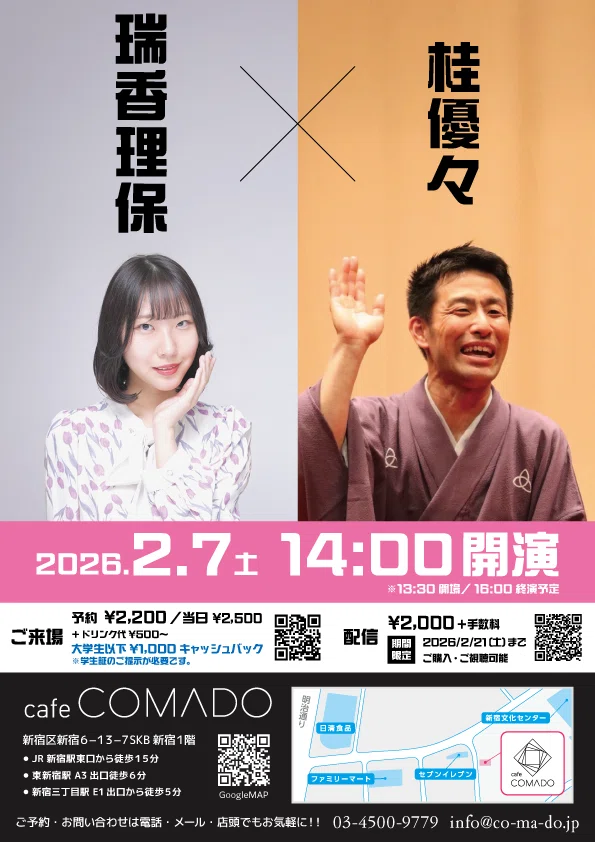 その前に、カフェコマド2年ぶりのホールライブ「コマド寄席ビヨンド」にお越しいただき、皆様ありがとうございました! 主催で大きな会場でのイベントは、集客や準備など、当日までいろいろと大変ですが、終えると本当に得られるモノが多く刺激的で、今後もやりたいと思いました。