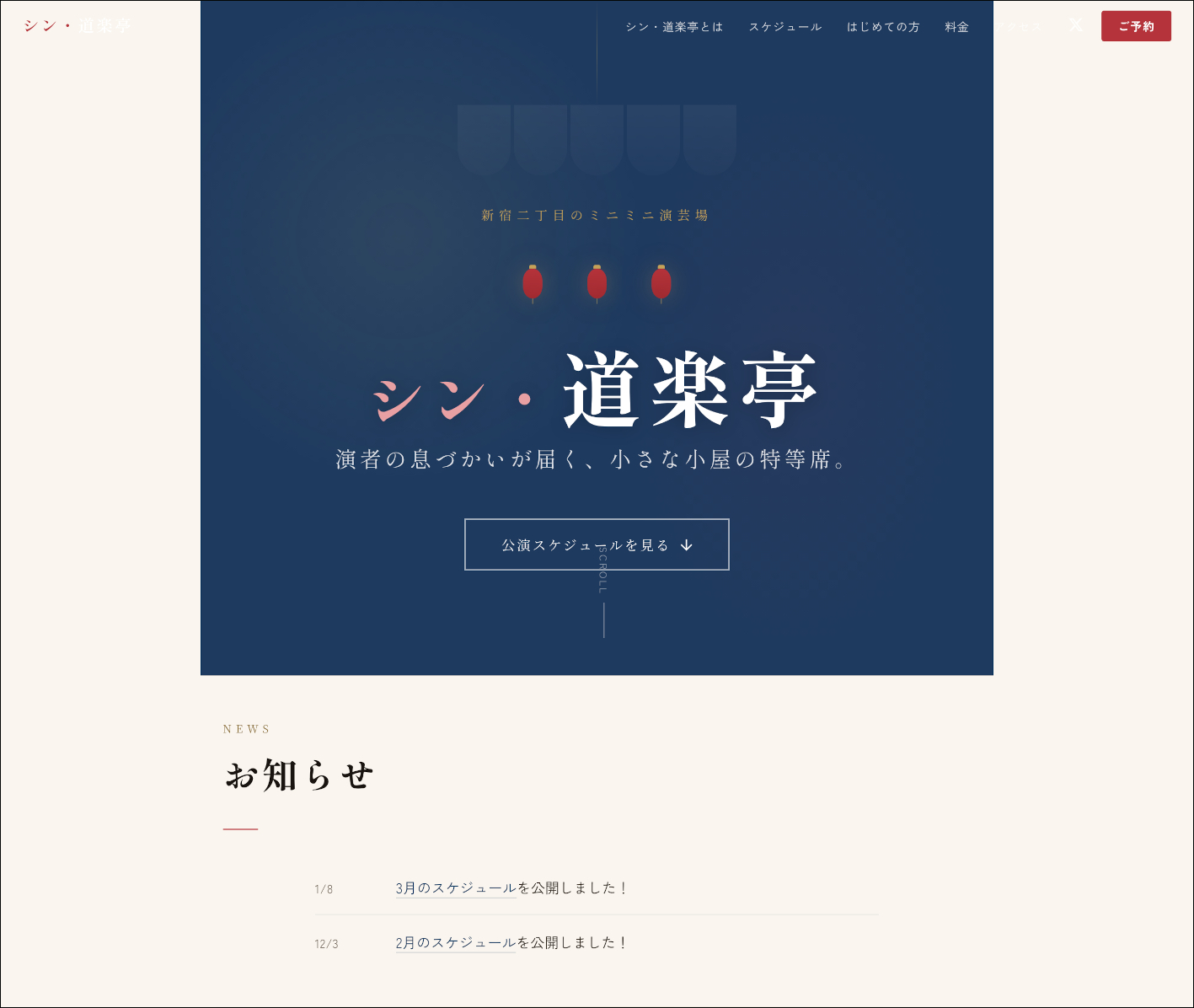 シン・道楽亭は、スケジュールが日々動く可変性の高いビジネスです。トップページの「近日のスケジュール」では直近8日間の公演を自動表示する仕組みにしてあるので、スケジュールページを更新すれば、トップページにも自動で反映されます。