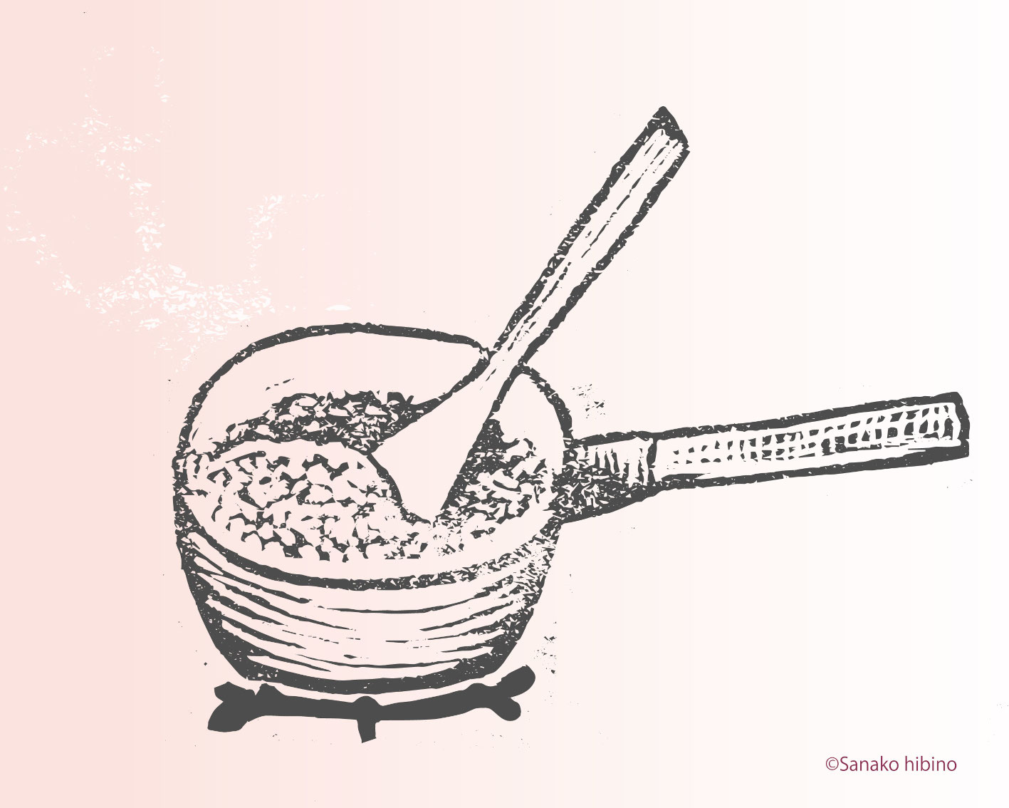 ③ 時々、底に米がつかないように、底から混ぜる。30分ほどすると、米がふわっと割れる。この状態を米の花が咲くなんて言う。