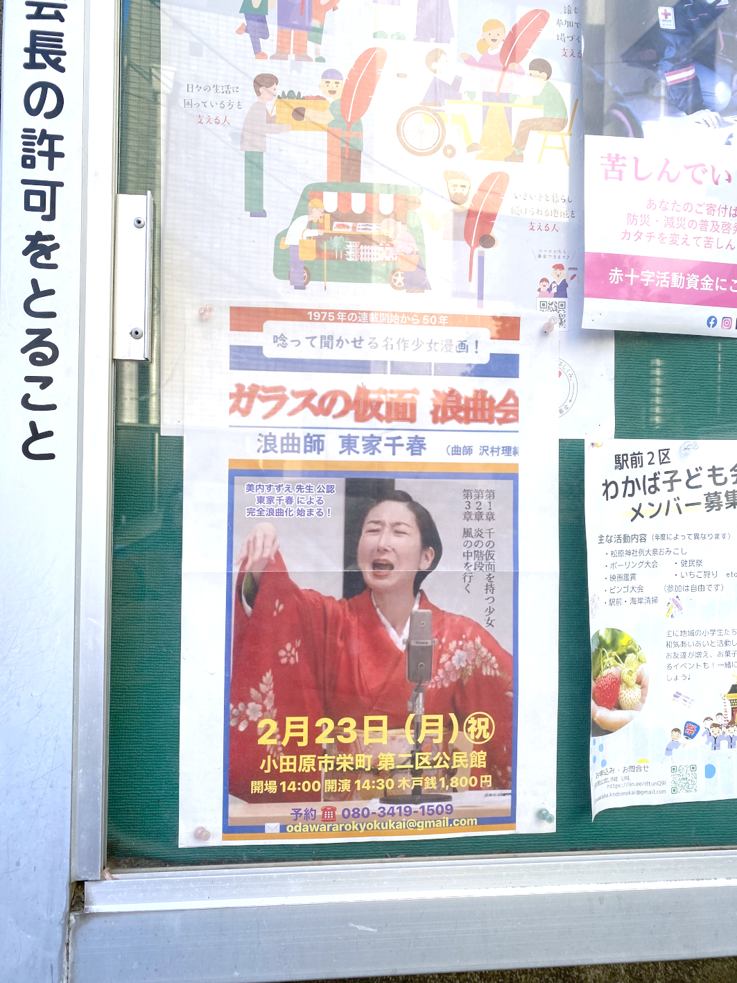 ホームページのお問い合わせフォームから、小田原でガラスの仮面の浪曲を口演してほしいというご依頼。当日までメールでのやりとりのみで、チラシやネットでの情報もなく当日を迎え、本当にこの会はあるのだろうかと不安になりながら指定の会場へ。ちゃんと会は開催されました。