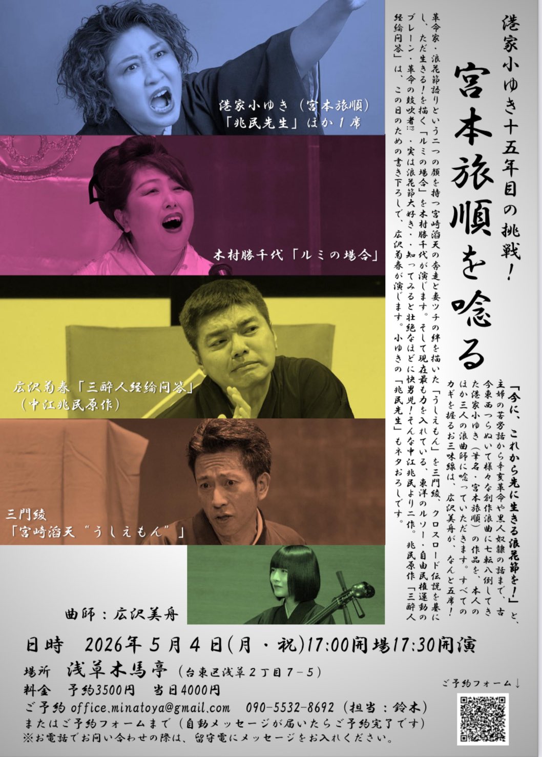 5月4日(月・祝)には「港家小ゆき十五年目の挑戦!」として「宮本旅順を唸る」の浪曲会が木馬亭で開催される。これは宮本旅順作品を小ゆきと他の浪曲師、木村勝千代、広沢菊春、三門綾が唸るという試みだ。これ以外にも6月20日(土)からアートスペース兜座を会場として、新作を中心とした小ゆきの定期浪曲会が始まることになっている。ぜひご注目を。