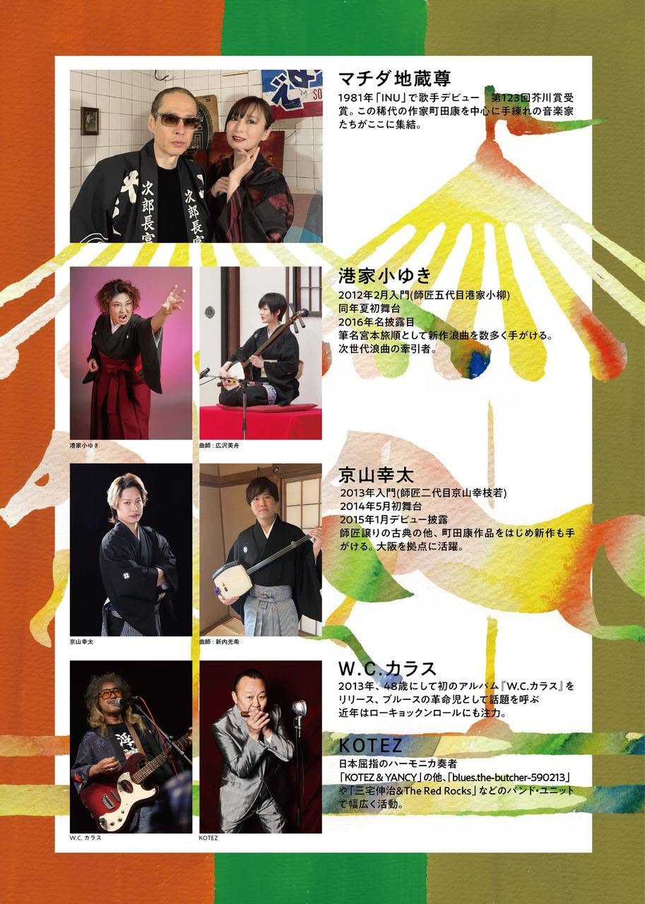 中入を挟んで、マチダ地蔵尊の演奏である。町田康(節付き朗読)、中村jizo敬冶(ag,cho)、浅野雅暢(sax,flute)、客田岳(b,ag,perc,cho)、emyu(violin、cho)という構成で、1時間近い演奏となった。途中で町田は木魚を出し、阿呆陀羅経よろしくチャカポコと叩いて歌った。その曲かどうかは失念してしまったが、中島らもの名を呼ぶ場面もあり、個人的には感慨深かった。世の中の出鱈目さを歌う詩人でもあった中島らもがもしこの世にいたら、浪曲をどんな風に聴いてくれていただろうか。