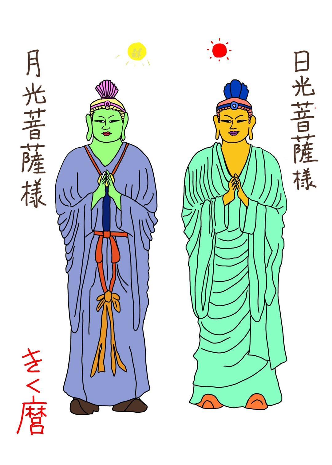 日光菩薩は、太陽の如く光を照らして苦しみの闇を消すといわれ、月光菩薩は、月の光のようなやさしい慈しみの心で煩悩を消すといわれています。昼も、夜も我々を守ってくれているってことですよ、ありがたいですね。24時間営業の先駆けですよ。