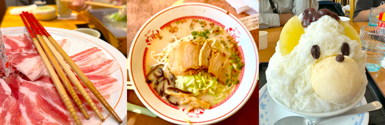 蕎麦つゆで食べる黒豚しゃぶしゃぶ、地鶏のたたき、酢味噌で食べるキビナゴの刺身、鶏ガラと豚骨の鹿児島ラーメン、両棒餅(ぢゃんぼもち)、なんと言っても甘い醤油で食べる刺身に、さつま揚げがたまらない。〆は勿論、しろくま(かき氷)。文字だけで見ると厳ついが、練乳味で、みつ豆、プルーン寒天、フルーツが盛り込まれた、子供の夢と希望が詰まったかき氷である。