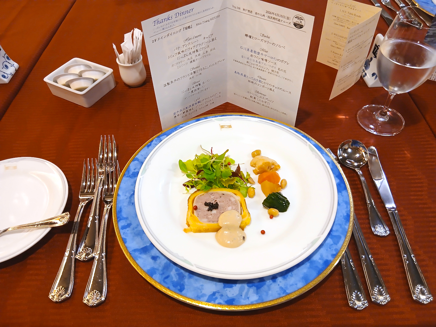 妙齢のご婦人の一人旅であればミステリアスな魅力を伴うが、家族連れや新婚旅行を除けば、圧倒的に若い(クルーズの乗客としては)男が一人、黙々とフルコースを食っている。「食のにっぽん丸」を標榜するだけあり、お味はとても素晴らしいのだが、それはそれとして、いったいこの若造は何者なのだ。もしや隣の老夫婦にそう思われてやしねえかと、毎回緊張が絶えない。